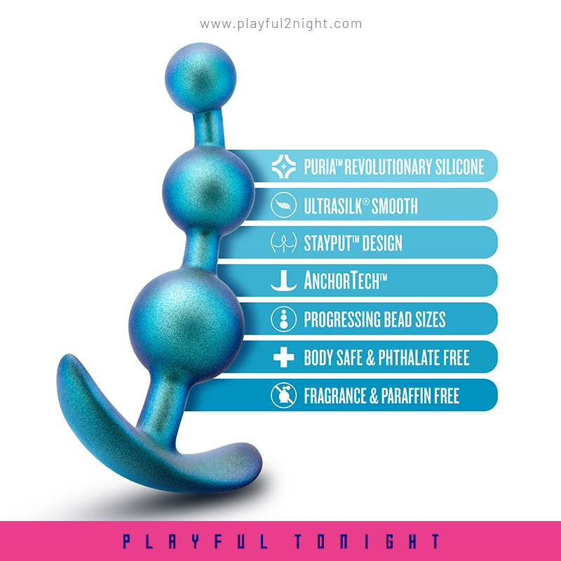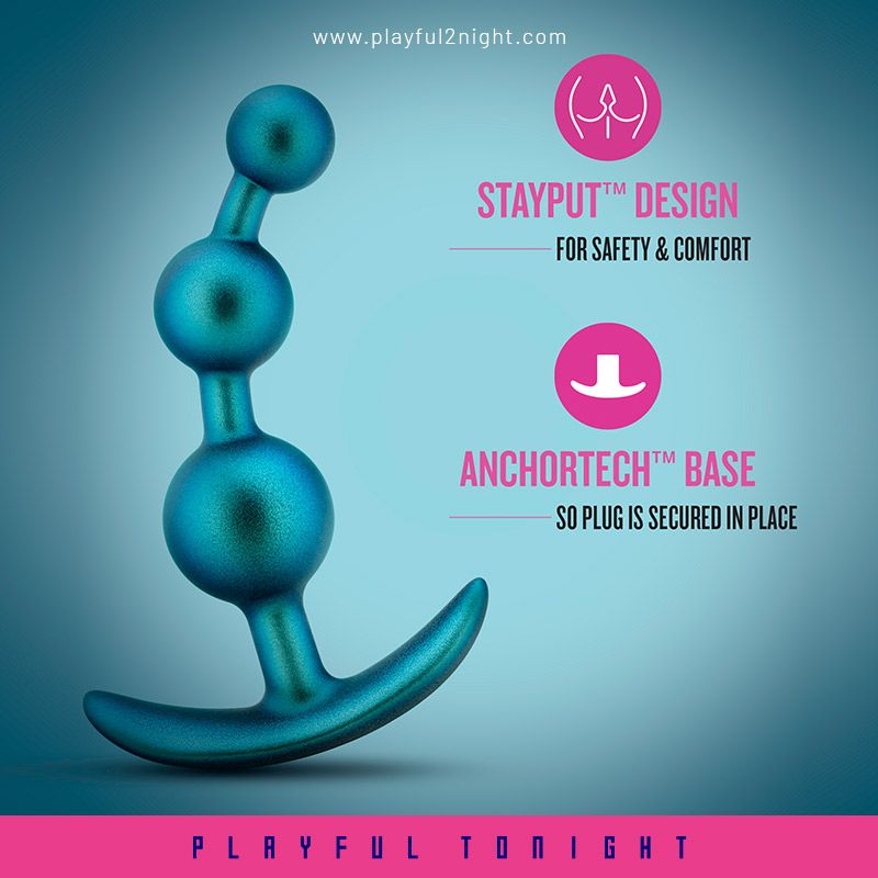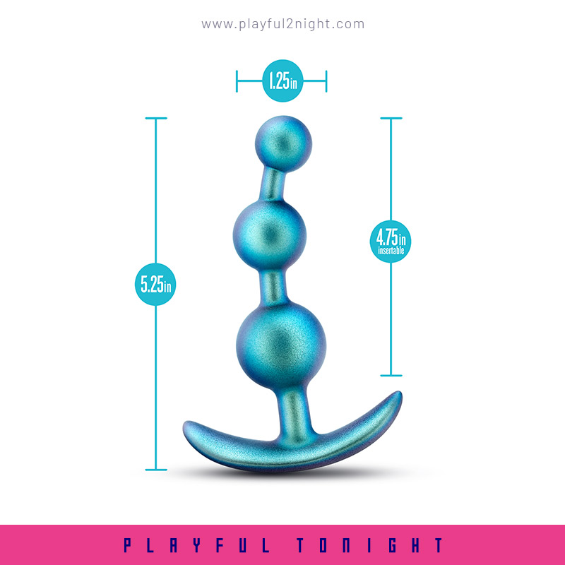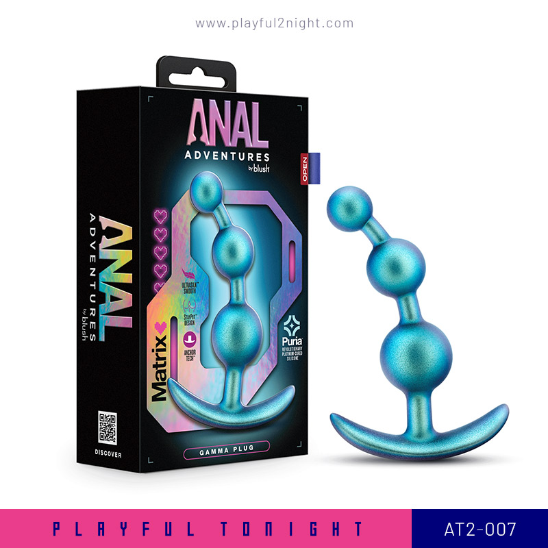 One of the key benefits of The Anal Adventures Matrix Gamma Plug is their ability to stimulate the nerve endings in the anus, which can lead to intense orgasms. The beads can also be used during intercourse to enhance the experience for both partners. It is rounded for easy insertion and has three progressive beads for further stimulation and a massaging feel during play! Finished in a Neptune Teal color the beautiful iridescent finish shimmers and seems to change color as it moves. The AnchorTech™ base keeps it safely inserted and comfortable for long term wear. The Gamma Plug is made of pure platinum-cured Puria™ silicone and enveloped in silky smooth Ultrasilk®. It’s body-safe and free of phthalates, paraffins, fragrance, and latex. Find your pleasure with Matrix! Sized for beginners and advanced users alike. 5.25″ Length x 4.75″ Insertable Length x 1.25″ Width. Water Based & Hybrid Lube Safe