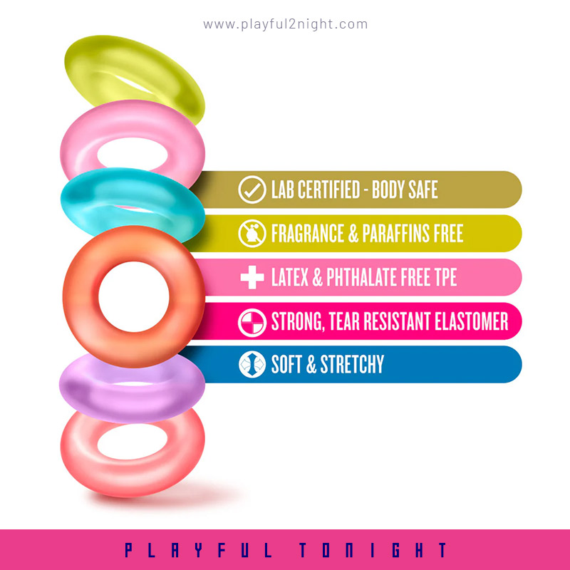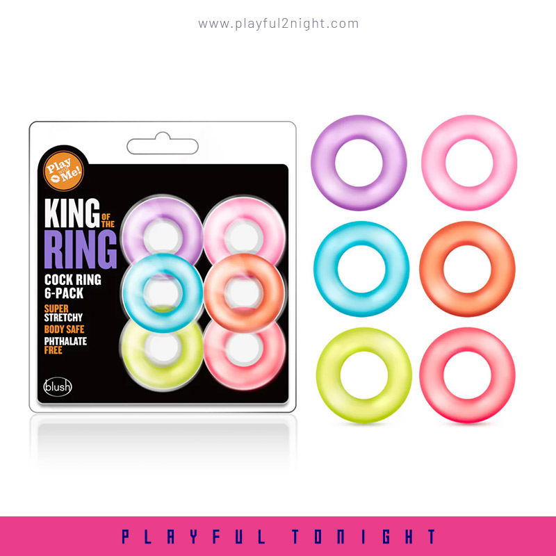 Play hard and increase your stamina with your King of the Ring six pack! These rings are a simple way to get harder, bigger and prolong your play! King of the Ring provides amazing benefits as these can be used around the shaft or both the shaft and testicles. Made of super stretchy elastomer. Easy to clean and good to go again and again. Just like you!