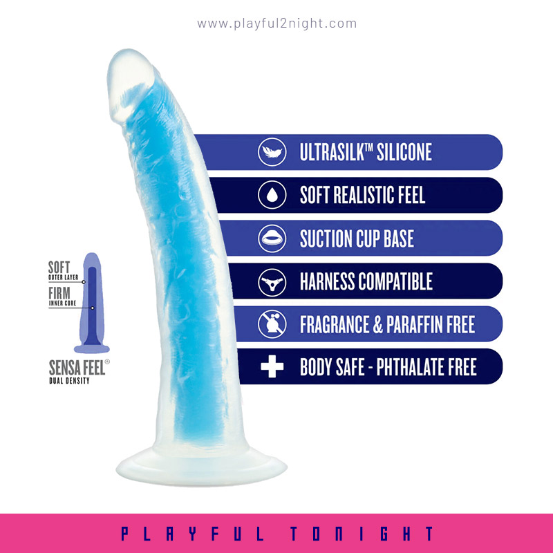 Illuminate your intimate moments with the Neo Elite Glow in the Dark Tao Silicone Dual Density Dildo. This exceptional dildo boasts Sensa Feel Dual Density technology, featuring a see-through layer over a firm core that not only shines in the darkness but also provides an ultra-realistic feel soft yet firm.