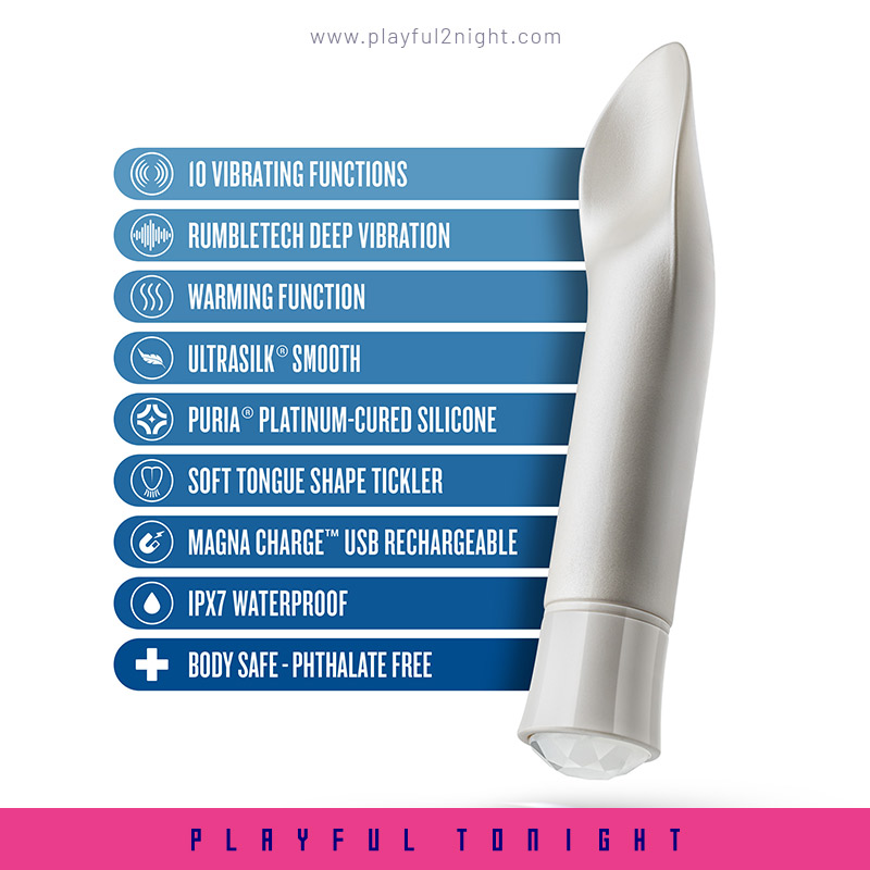 Diamonds are bold and beautiful. You like to arouse and give your all to pleasure when you play. Bold is prepared to embrace your dedication and passion with you every step of the way as you experience new heights of intimacy. The scooped shape is meant to encompass the area of choice and deliver a variety of different sensations. It’s time to be Bold! Warms to up to a very comfortable 107 degrees Fahrenheit for increased blood flow and enhanced pleasure. Made from our pure platinum-cured Puria™ silicone and enveloped with our satin smooth UltraSilk® this bold vibrator offers a smooth and comfortable experience for all users. Water based, hybrid lube compatible. Oh My Gems are hypoallergenic and body safe!