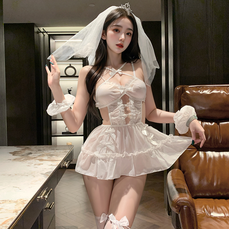 - Complete Bridal Set: Includes a lace babydoll dress, T-back thong, veil, and sheer stockings.
