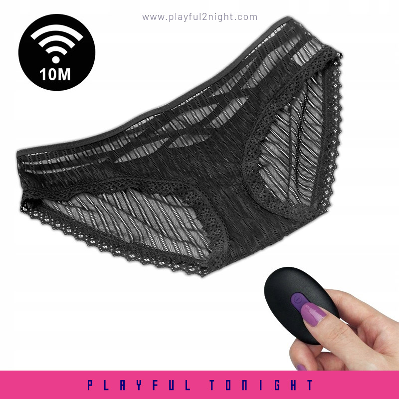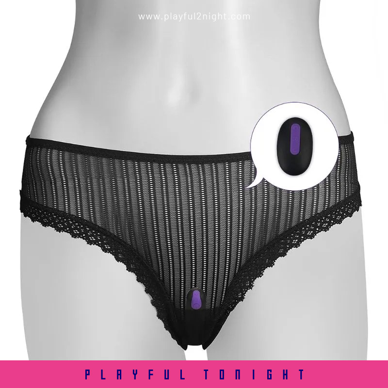 A hidden pocket in the crotch of the lace thong holds the included 3 speeds 7 functions mini vibrator, positioned into a tiny saddle for comfortable and discreet stimulation. Remote control operable up to a range of 10 meters for fun.