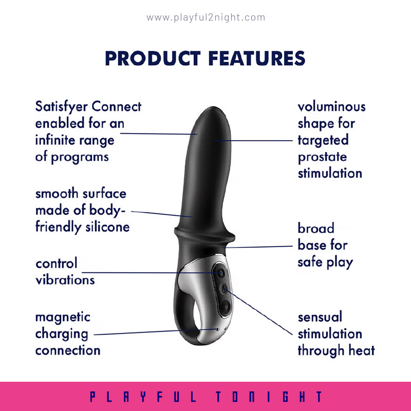 Get creative and connect the Satisfyer Hot Spot to the free Satisfyer Connect app for iOS and Android: Enjoy functions such as creating your own vibration patterns, let the warming vibrator vibrate to the beat of your favorite hits on Spotify, or hand over control to your sweetheart.With its soft surface made of body-friendly, high-quality silicone, the app-controlled Satisfyer Hot Passion is particularly gentle on your skin. Owing to the waterproof finish (IPX7), it doesn’t shy away from adventures in your shower or bath. After thoroughly enjoying yourself, you can recharge the integrated batteries with the included USB charging cable.