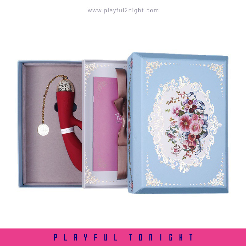 - Contents: Rosalie, USB charging cable, Satin storage pouch, Warranty card, Instruction manual